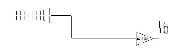 但是,上述只是一種比較極端的情況,更多的場合是沒有這么好的條件的,往往需要在十米二十米以外才能找到強(qiáng)信號,這時,用這種簡單的方法就不能奏效了。因為在900MHz頻段,電纜的損耗是比較大的,而小天線與手機(jī)之間的信號傳輸也有不小的衰減量,這樣高增益天線和手機(jī)之間無法實現(xiàn)有效地傳輸,當(dāng)然也就無法通信了。解決的辦法是在傳輸途徑中插入放大器來彌補(bǔ)傳輸損耗,如下圖所示。